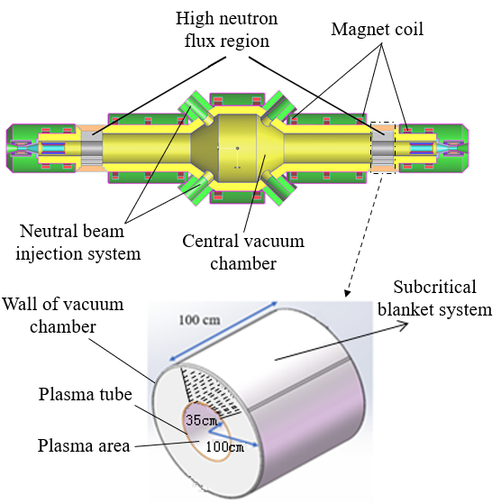 图1 气动磁镜聚变中子源驱动次临界包层生产医用同位素方案示意图